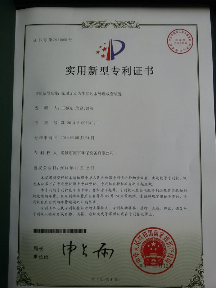 熱烈祝賀我公司申請家用無動力生活污水處理裝置獲得成功。